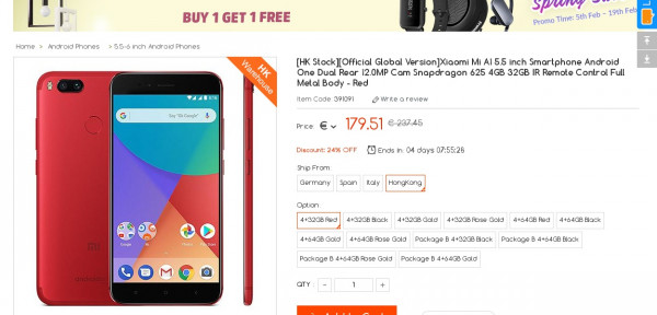Recevez une réduction sur le Xiaomi Mi A1 Smartphone Snapdragon 625 4GB 32GB (-30$) ou en utilisant le code HVSUYBWG. Ce bon plan est valable jusqu'au 06/03.