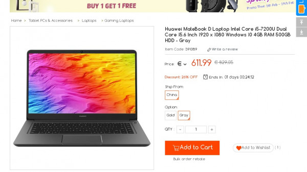 Recevez une réduction sur le Huawei MateBook D Laptop i5-7200U Dual Core 4GB RAM 500GB HDD (-87$) ou en utilisant le code GKBH14T. Ce bon plan est valable jusqu'au 06/03.