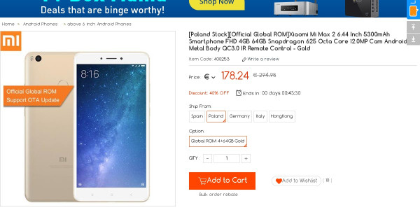 Recevez une réduction sur le [Poland Stock]Mi Max 2 4GB 64GB Gold (-10$) ou en utilisant le code HJJQJJQB. Ce bon plan est valable jusqu'au 20/10.