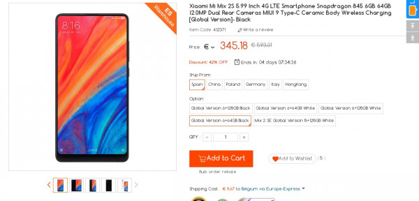 Recevez une réduction sur le Xiaomi MI MIX 2s 6gb 64GB Black Global Version ES Stock (-10$) ou en utilisant le code WUBHQPED. Ce bon plan est valable jusqu'au 15/02.