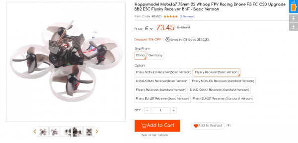 Recevez une réduction sur le Happymodel Mobula7 Flysky Receiver BNF - Basic Version (-3$) ou en utilisant le code SDPDATEU. Ce bon plan est valable jusqu'au 15/02.