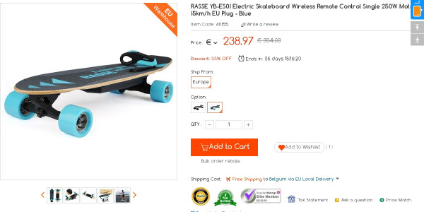 Recevez une réduction sur le RASSE YB-ES01 Electric Skateboard (-6$) ou en utilisant le code GKB036S. Ce bon plan est valable jusqu'au 15/02.