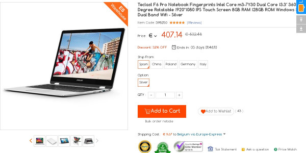 Recevez une réduction sur le Teclast F6 Laptop Intel Apollo Lake N3450 (-6$) ou en utilisant le code FILOIZMQ. Ce bon plan est valable jusqu'au 10/03.