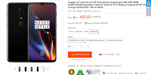 Recevez une réduction sur le Oneplus 6T 6GB 128GB Black (-10$) ou en utilisant le code GGBIFJAI. Ce bon plan est valable jusqu'au 15/02.