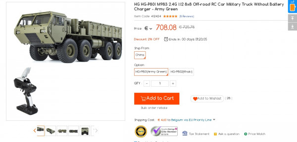 Recevez une réduction sur le HG HG-P801 M983 2.4G 1:12 8x8 Off-road RC Car (-354$) ou en utilisant le code VLDEPUVJ. Ce bon plan est valable jusqu'au 15/02.