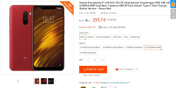 Recevez une réduction sur le Xiaomi Pocophone F1 6GB 64GB red (-10$) ou en utilisant le code RKVCJGCS. Ce bon plan est valable jusqu'au 15/03.