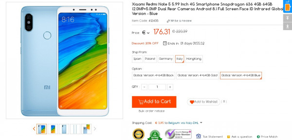 Recevez une réduction sur le Global Version Xiaomi Redmi Note 5 4GB 64GB - Blue (-4$) ou en utilisant le code FOGPIRFD. Ce bon plan est valable jusqu'au 19/03.