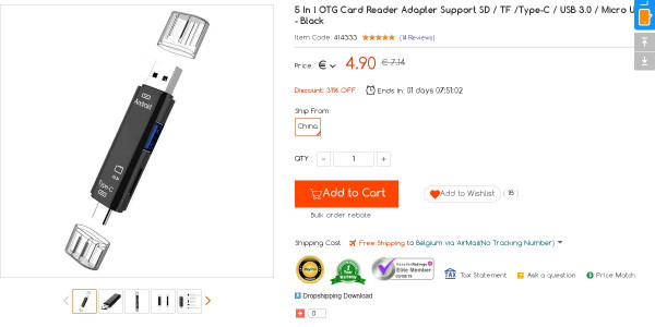 Recevez une réduction sur le 5 In 1 OTG Card Reader Adapter Support SD / TF /Type-C / USB 3.0 / Micro USB - Black (-1$) ou en utilisant le code SBMHTDUM. Ce bon plan est valable jusqu'au 19/03.