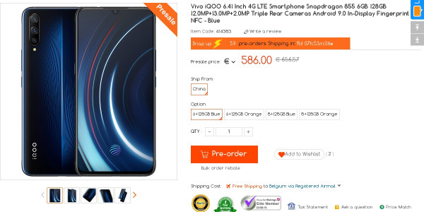 Recevez une réduction sur le Vivo iQOO 6GB 128GB (-56$) ou en utilisant le code WOXANMPR. Ce bon plan est valable jusqu'au 04/04.