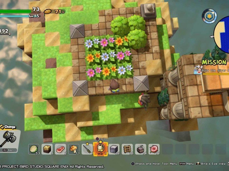 Dragon Quest Builders 2 propose également une gamme de nouveaux outils qui simplifient grandement les choses. Une flûte qui peut trouver des matériaux rares dans les montagnes, un arrosoir sans fond qui vous permet de transporter du liquide et de le verser où vous le souhaitez et d’autres éléments comme l’outil d’échange qui permet de remplacer un matériau par un autre. Se déplacer est également beaucoup plus facile car vous pouvez maintenant planer et profiter du vent, grimper au sommet d'une colline et sauter pour voyager à une vitesse deux fois supérieure et survoler les obstacles. Vous pouvez aussi vous déplacer sous l'eau, ce qui est une première dans la série. Mais la véritable vitrine du savoir-faire vient après que vous ayez terminé les principales îles et que vous vous dirigiez vers l’île de l'Éveil. C'est ici que tout ce que vous avez appris entre en perspective avec une quantité infinie d'exploration et de créativité. C'est votre terre et vous pouvez faire ce que vous voulez avec les choses que vous avez apprises à faire sur les îles que vous avez sauvées. Vous pouvez naviguer vers de petites îles et trouver de nouveaux matériaux, des semences et des outils rares et les ramener pour les utiliser dans votre dernière création. Heureusement, le jeu vous donne encore un peu d'indication, car l'île de l'Éveil est divisée en zones spécifiques telles que l'agriculture et les mines. Ce qui signifie que vous n'avez pas besoin d'être submergé par les options et vous demandez où construire quoi. Les citoyens que vous ramenez avec vous trouvent tous un endroit où travailler, et si vous construisez une ferme, ils y cultiveront. Une région était une terre en friche, mais avec suffisamment de temps et d’efforts, vous pouvez la transformer en une terre agricole animée avec de l'herbe luxuriante, plus de cent blocs de terre et assez d’espace pour que chacun puisse manger, dormir et même se laver. Vous pouvez ensuite y revenir après avoir déverrouillé des centaines de nouvelles créations sur la deuxième île et par exemple fabriquer une piscine. Tout le monde l'appréciait et cela se voyait par la quantité de cœurs laissés sur le sol, qui a servi de devise pour déverrouiller une nouvelle île à explorer et des recettes à élaborer.