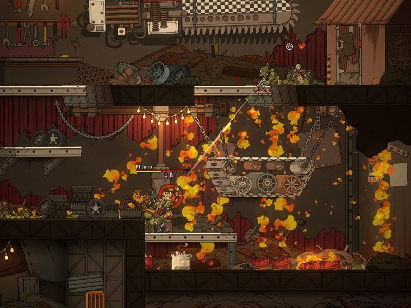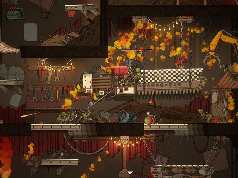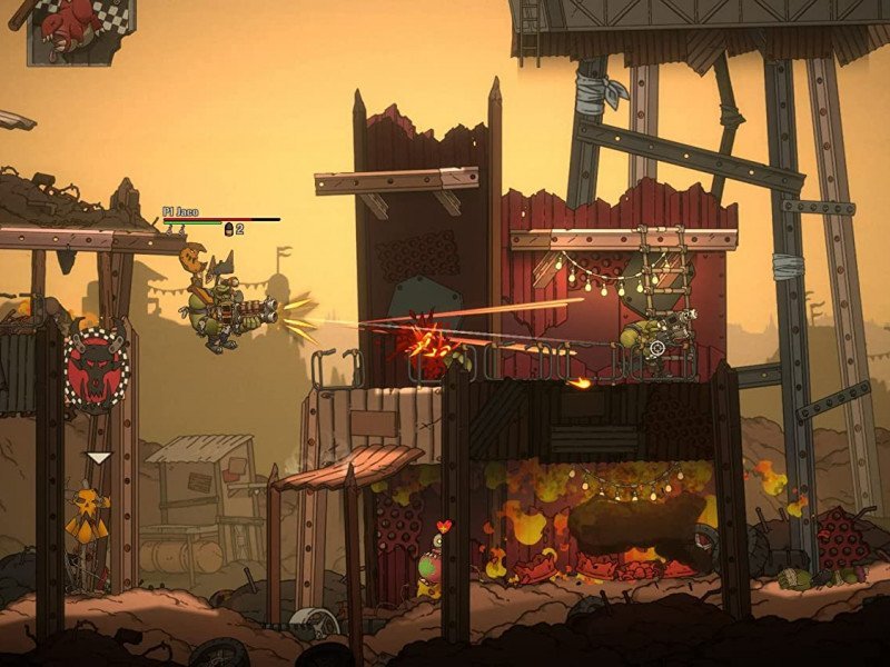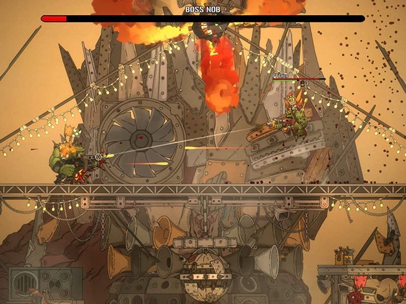 Le gameplay, quant à lui, est aussi simple qu'additif : on progresse dans les niveaux à défilement latéral en sautant de plateforme en plateforme tout en faisant exploser tout ce qui se trouve sur notre chemin. Au cours de nos aventures, nous accumulerons également des dents (beurk !), la monnaie en usage chez les Orks, que nous pourrons dépenser pour améliorer notre équipement (Dakka) ou acheter des ornements pour notre peau verte, comme des chapeaux et autres. Les commandes sont précises et les niveaux très bien pensés, bien qu'à certains endroits le jeu puisse être un peu pénible. Rien qu'un peu d'entraînement avec la manette ne puisse résoudre, également parce que les points de contrôle sont fréquents et bien placés. Chaque partie "occasionnelle" de Warhammer 40,000 : Shootas, Blood & Teef risque de se transformer en véritable marathon, tant le gameplay est amusant et addictif ! Ajoutez à cela (et ce n'est pas une mince affaire) une bande-son INCROYABLE, un métal Orcxesque à cornes qui ne déparerait même pas sur la bande-son de Metal : Hellsinger, des graphismes cartoonesques dessinés à la main, propres et fluides et, enfin et surtout, un souci du détail effrayant. Les personnages, les ennemis et le level design lui-même, en fait, reproduisent pratiquement tout ce qu'il y a à voir dans l'univers WH40K, avec des caractéristiques parfaitement équilibrées entre le caricatural et le précis.