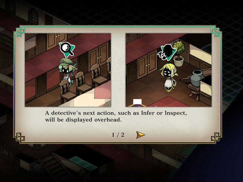 Cependant, une fois l'enquête commencée, on a l'impression d'être soudainement transporté dans un jeu vidéo totalement différent. Après le premier meurtre, les détectives commencent l'enquête, ce qui nous met face à des personnages non seulement stéréotypés (typiques de ce genre de production), mais aussi profondément faillibles ; ils ne peuvent pas toujours comprendre les choses par eux-mêmes, mais ils ne veulent pas non plus admettre qu'ils ont besoin d'aide. C'est là que Wata intervient. Ce dernier, et par extension le joueur, peut donner des suggestions ou des ordres aux autres détectives. La scène de crime se transforme alors en une grille à base de tuiles, avec des points d'intérêt et des indices possibles mis en évidence dans différentes pièces, et un chronomètre marquant le temps disponible pour balayer la zone. À ce stade, Process of Elimination devient un jeu de stratégie. À chaque tour, à moins que vous n'interveniez, les détectives offriront leurs idées qui ne mèneront probablement à rien. La tâche du joueur consiste en fait à coordonner les différents détectives et à les faire travailler ensemble pour découvrir la vérité sur l'affaire. Au cours d'un tour, le joueur peut déplacer un détective à côté d'un autre afin d'augmenter leur capacité à enquêter sur un seul point d'intérêt. Il peut aussi les placer dans des zones et des directions différentes pour leur permettre de couvrir une zone plus large, ce qui se traduira par des résultats moins précis. Alors qu'un détective peut être doué pour trouver des indices, un autre peut être meilleur pour les analyser et en tirer des conclusions, la tâche du joueur sera donc de trouver la bonne combinaison de personnages. Au début, ces phases de jeu peuvent sembler assez déroutantes et, en ce sens, l'écran qui encadrera ces sections du jeu ne sera pas d'un grand secours. Au commencement du jeu, de nombreuses interfaces utilisateur et de nombreux chiffres sont incompréhensibles et les menus utilisent des termes similaires pour des actions différentes. Il faudra plusieurs minutes de jeu avant de maîtriser pleinement ces phases de jeu, et ce malgré la présence d'un didacticiel qui guide le joueur à chaque étape.