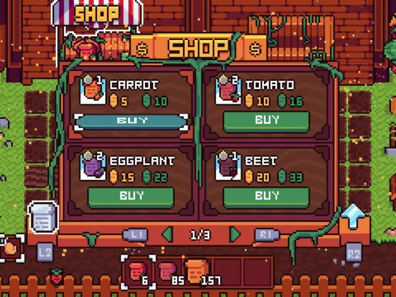 Développé par Nerd Games et édité en synergie avec Eastasiasoft, il s'agit d'un petit jeu de gestion agricole divisé en défis chronométrés. Trivialement, il s'agit de remplir une série d'exigences de niveau en niveau. Agriculture n'a aucune intrigue. Rien du tout. Pas même un prologue, une vidéo d'introduction, quelques lignes pour simuler un semblant de décor. Rien. D'autre part, le titre n'a pas l'intention de raconter une histoire ou de justifier notre activité. Ce qu'il faut savoir est visible à l'écran : nous sommes un agriculteur avec sa propre terre (divisée en deux massifs) et une série de tâches à accomplir avant la fin du temps imparti. C'est tout ce qu'il y a à savoir. Après avoir constaté que Agriculture est dépourvu de toute trame narrative ou de lore quelconque, il est bon de prendre sa houe, son arrosoir et ses graines et de commencer notre voyage à travers les champs pixelisés. Agriculture se présente comme un jeu de gestion agricole mais a en fait une structure de jeu de puzzle (similaire à des titres comme Slap the Rock). L'ensemble du jeu est décomposé en 50 défis, tous sur le même champ, à tour de rôle enfermé dans un seul écran fixe. Il n'y a rien d'autre, pas d'exploration ou d'interaction avec des PNJ de quelque sorte que ce soit, à part deux étals. Mais procédons dans l'ordre. Dans Agriculture, nous avons le contrôle direct d'un fermier, le seul individu qui se déplace à l'écran. En haut à droite, nous avons notre objectif, qui est essentiellement constitué du nombre de légumes et de fruits que nous devons cultiver et vendre avant la fin du temps imparti (dont le chronomètre est toujours visible à l'écran). Chaque niveau a ses propres objectifs et un certain temps pour tout faire.