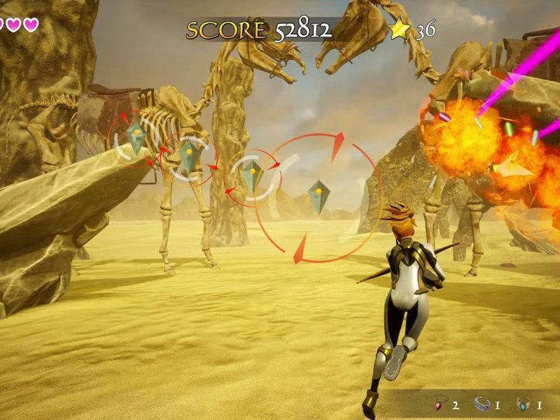 Sur le plan du jeu, malgré les presque quatre décennies qui nous séparent du Space Harrier original, Air Twister présente peu de révolutions, certainement pas nécessaires quand on se retrouve en présence d'un concept toujours vert. La structure sur rail restant inchangée, nous devrons exploiter la motricité d'Arch pour éviter les balles, tout en essayant simultanément d'utiliser notre blaster pour éliminer les différentes vagues ennemies, jusqu'à atteindre les boss finaux. Ceux-ci nous attendront à la fin de chaque niveau, et se caractériseront par de très grandes dimensions, de manière à couvrir souvent une grande partie de l'écran, ainsi qu'à présenter toujours différents types d'attaques. Les power-ups achetables dans le menu principal (nous ne pourrons en équiper qu'un à la fois) vont un peu mélanger les choses et pourront apporter des protections supplémentaires et des bonus passifs, utiles pour faciliter notre sortie. Il n'y a pas grand chose d'autre à dire sur le mode principal d'Air Twister , qui n'est rien de plus qu'une version plus moderne du gameplay de Space Harrier : à prendre ou à laisser. Cependant, comme mentionné précédemment, l'expérience de jeu ne s'arrête certainement pas là, étant donné que Suzuki-san a jugé bon d'inclure une grande quantité de mini-jeux accessoires, ainsi que des modes secondaires. En gros, vous retrouverez les traditionnels boss rush, time Attack, mode arcade et bien plus encore, le tout accompagné de défis hebdomadaires et quotidiens, utiles pour augmenter notre butin d'étoiles. Ce qui ressort, à la fin de l'analyse, est un mélange immédiat et insouciant qui parvient à offrir un bon défi et un plaisir à l'ancienne qui reste toujours solide.