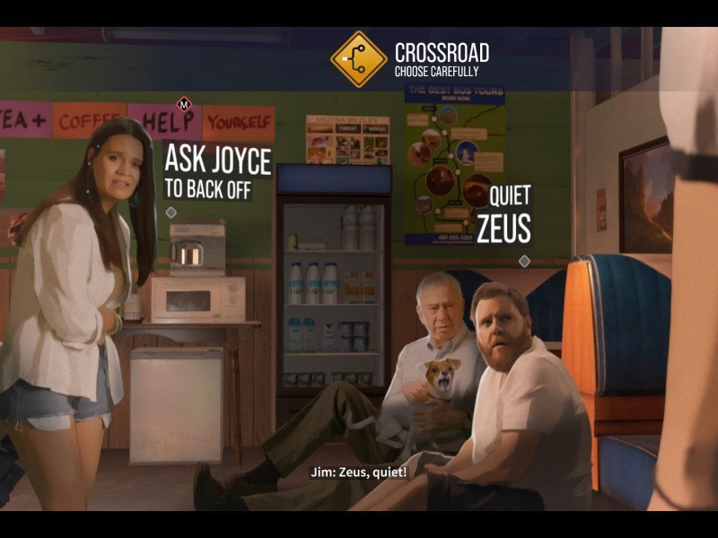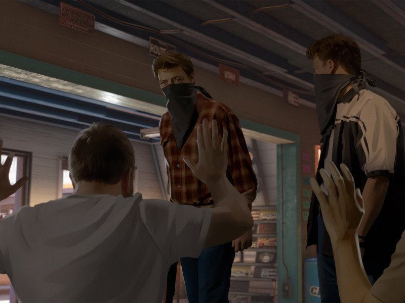Cela nous dérange un peu car, bien qu'il y ait des changements de ces plans tout au long des dialogues, il n'y a pas de mouvement de lèvres. Alors que As Dusk Falls a pris la peine de doubler le jeu en français, les répliques semblent très aléatoires, sortant de bouches pratiquement statiques, dans un jeu qui recherche une grande vraisemblance. Il a fallu un certain temps pour s'y habituer. Pour cette raison, il est difficile d'identifier les acteurs vocaux de chaque personnage. Car, bien souvent, il y a des conversations croisées en arrière-plan, car nous sommes dans un environnement très stressant (un braquage suivi d'un enlèvement), ce qui rend difficile la compréhension de certaines répliques. Cela peut être résolu, bien sûr, en activant les sous-titres, mais le jeu est livré, par défaut, avec les sous-titres désactivés.