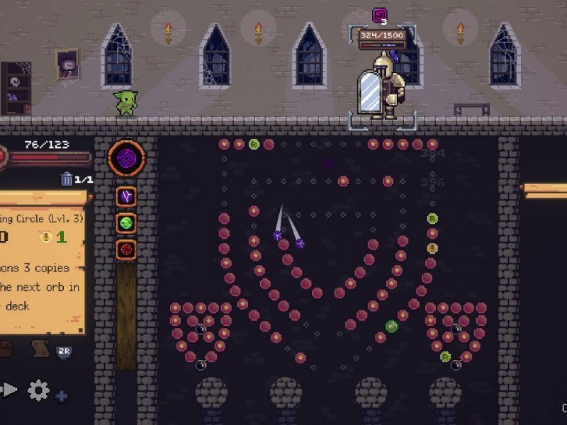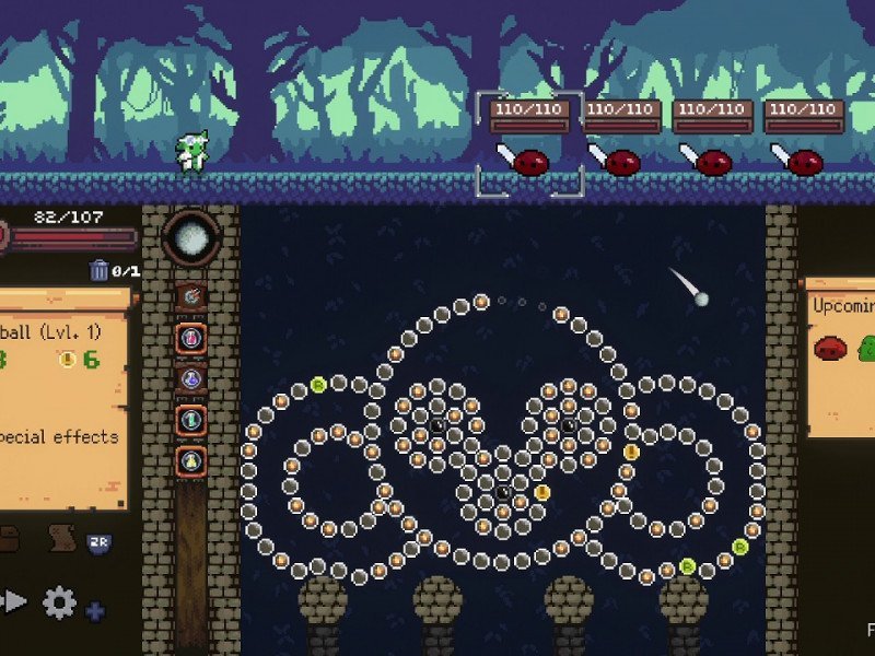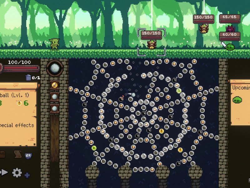 Ce qui rend le jeu bien organisé, ce sont les extras. Vous avez donc un menu où vous pouvez voir toutes les améliorations, un autre où vous pouvez voir tous les ennemis et un système de réussite. Ces menus vous montrent comment débloquer des améliorations et des personnages ultérieurs (les personnages sont essentiellement votre Peglin avec un chapeau et un autre type de balle). Cela garantit que vous reprenez le jeu plus souvent pour jouer un peu plus longtemps afin de pouvoir tout débloquer. Vous disposez également d'options pour rendre votre prochaine partie un peu plus difficile à chaque fois que vous « terminez » le jeu. Cela fonctionne pendant un certain temps, mais encore une fois, cela ne fonctionne que jusqu'à un certain niveau. À un moment donné, vous avez tout vu et le jeu perd son effet wow. Il existe un nombre satisfaisant de boss (neuf) et de types d'ennemis sélectionnés aléatoirement (même s'ils ne sont pas surprenants), mais jouer au pachinko a ses limites aussi mignon et créatif qu'il soit.