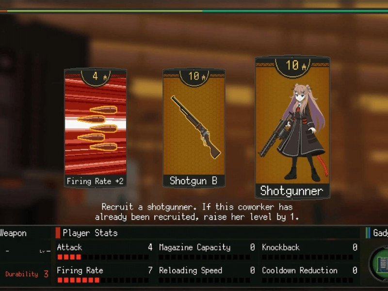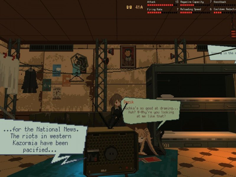 Les cartes que nous pouvons obtenir sont de différents types et vont des armes (très différentes et amusantes à maîtriser mais qui ne durent que certains tours) aux objets de soutien. Il en existe deux types, ceux à rechargement automatique et ceux à usage unique (et donc consommables). En plus de celles-ci, il existe également des cartes spécifiques liées à des missions possibles, comme la mise à niveau de l'objectif à défendre ou de certaines barricades, etc. Ensuite, il y a les cartes de mise sous tension qui améliorent de manière permanente les statistiques de Snezhinka, de la puissance d'attaque à la portée, en passant par la vitesse de rechargement de l'arme de soutien et l'énergie de la cible. Chaque statistique a un niveau plafond fixe de 15 au-delà duquel aucun retour concret ne sera obtenu. Mais les surprises des cartes ne s'arrêtent certainement pas là , la meilleure partie manque encore ! Le dernier type de carte est celui des « alliés » (il y en a sept au total). Au cours de l'aventure, en effet, nous pourrons acheter un allié qui restera à nos côtés, protégeant notre même objectif. Chaque allié a ses propres caractéristiques et une arme spécifique et, pour les améliorer, il faudra racheter la même carte allié. De plus, au cours d'une course, nous pourrons également acheter différents alliés qui, cependant, remplaceront le précédent. Avec un allié actif, les moments de tranquillité entre une mission et une autre nous verront dans des mini-sketchs à l'intérieur de notre hub. Un endroit où vous pouvez vous déplacer librement et passer un tour dans l'une des différentes options disponibles. Parmi celles-ci, il y a « manger » qui peut augmenter une ou plusieurs statistiques du protagoniste, faire des petits boulots pour gagner de l'argent supplémentaire, etc. Pour réussir à Snezhinka, il faut savoir bien gérer ses ressources, en gardant à l’esprit que le gouvernement peut nous taxer encore plus, ce qui aggravera nos finances. Alors oui, dans certains cas il vaut mieux ne pas dépenser d'argent alors que dans d'autres vous pouvez l'investir pour défausser des cartes et en piocher de nouvelles afin d'avoir plus de choix. Il convient également de mentionner certains moments difficiles où des événements particuliers peuvent se produire (positifs ou négatifs selon les cas).