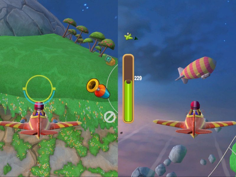 Pour ceux qui ont une bonne mémoire, le titre Stunt Flyer peut sembler familier : il s'agit en fait d'une réédition améliorée d'un jeu sorti sur Wii en 2011. Stunt Flyer ne repose pas sur une intrigue complexe. Le joueur incarne un pilote d'avion engagé dans une série de 40 missions réparties sur trois îles différentes . Dès le début, vous êtes immédiatement propulsé dans le didacticiel, où vous apprenez les bases du pilotage. Ne vous attendez pas à des commandes complexes : le jeu mise entièrement sur la simplicité et l'immédiateté. Les joysticks analogiques permettent de tourner, tandis que les boutons latéraux servent à accélérer, freiner et effectuer des manœuvres comme le tonneau. La version modernisée propose des commandes plus réactives et fluides que l'original , rendant l'expérience Stunt Flyer encore plus accessible et immédiate. Les missions se déroulent dans une zone aux allures de parc d'attractions aérien , avec divers défis disséminés sur l'île. L'une des premières épreuves est une course chronométrée où vous devez franchir des anneaux rouges pour gagner des points d'expérience. Une autre mission consiste à atteindre des cibles avec une mitrailleuse légère : en suivant les points d'exclamation, vous pouvez identifier les cibles à abattre. Une fois le réticule aligné, le cercle devient vert, indiquant la précision du tir. Si vous êtes à court de munitions, survolez simplement l'eau pour recharger l'arme et gagner de l'XP, utile pour débloquer de nouveaux skins et améliorer votre pilote.