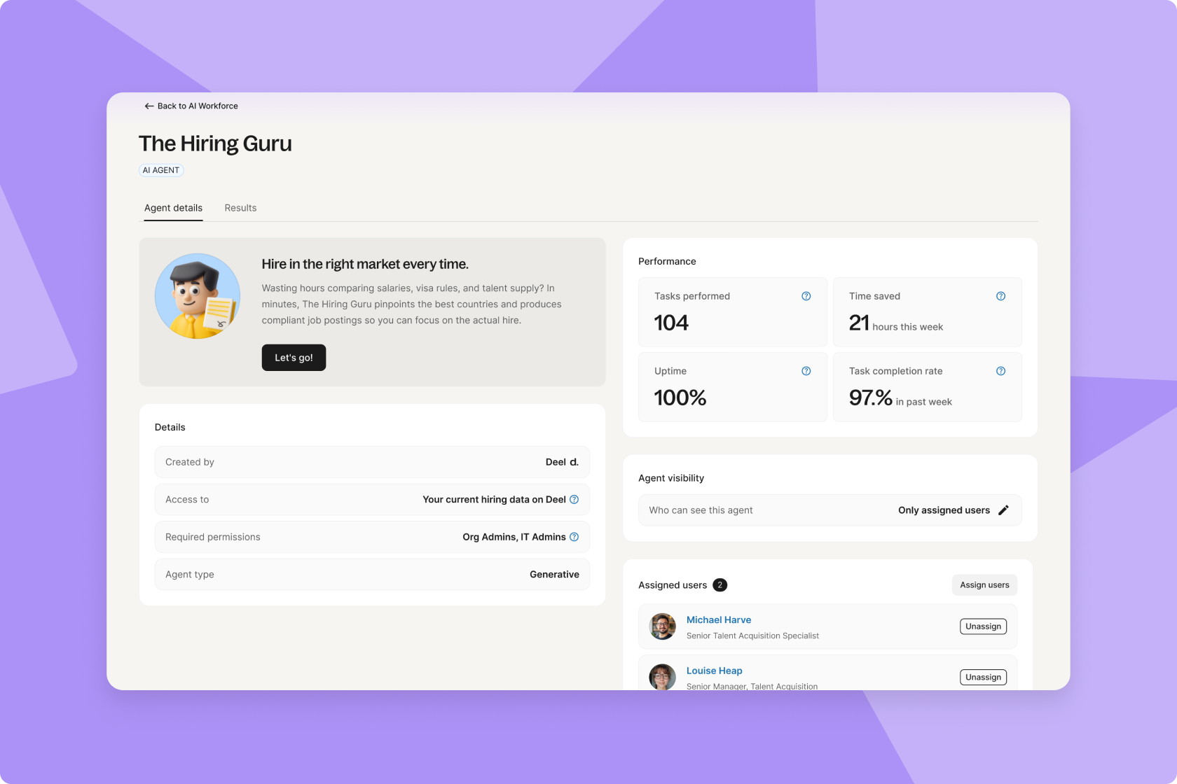 Disponible dès aujourd’hui en version bêta, Deel AI Workforce permet de déployer instantanément ces agents préconfigurés dans les domaines des RH, de la paie, du recrutement, de la finance et des opérations. Chaque agent IA bénéficie de l’expertise de plus de 2 000 spécialistes locaux et peut fonctionner immédiatement en conformité dans plus de 150 pays, tout en mesurant son impact directement sur la plateforme : heures économisées, tâches réalisées, erreurs évitées. Les clients pourront aussi créer des agents personnalisés au sein de la plateforme Deel, à compter d’aujourd’hui.