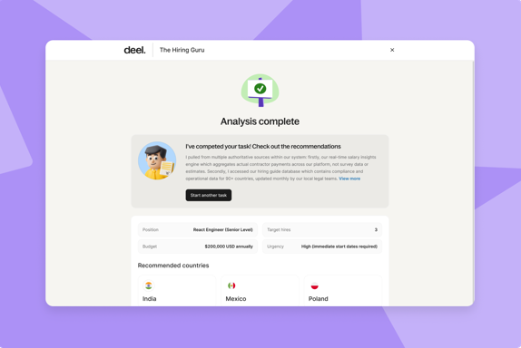 - Un agent IA de recrutement qui analyse instantanément les besoins du poste et le budget pour recommander les pays les plus stratégiques où sourcer des candidats, réduisant ainsi le temps de recherche et optimisant les recrutements.
