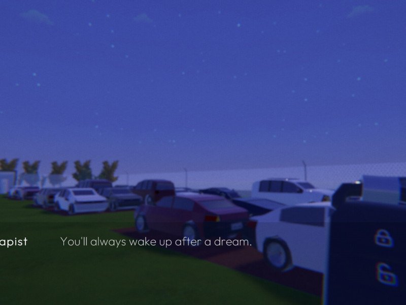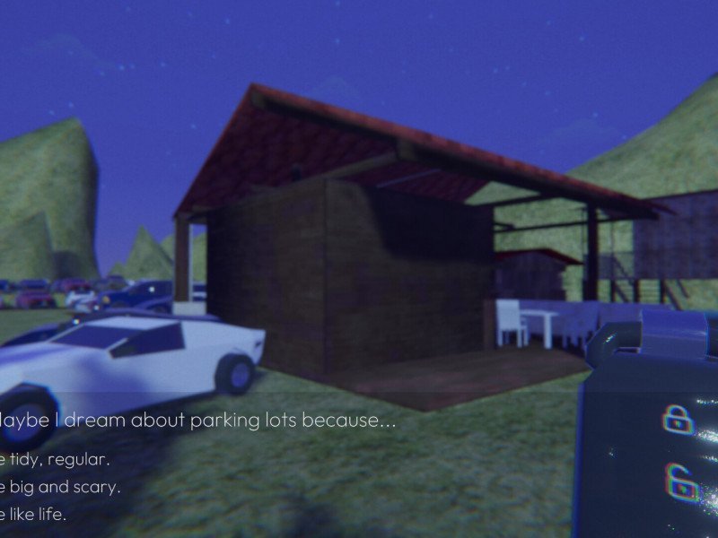 Imaginé par Interactive Dreams et porté sur consoles par Take It Studios, A Dream About Parking Lots se veut une véritable expérience de vie, un voyage à la recherche de quelque chose de profond. Ou peut-être simplement de votre propre voiture. Qui n'a jamais perdu sa voiture dans un parking ? Un mauvais étage dans un immense parking, une situation courante, ou simplement une négligence, peuvent nous conduire à errer comme des zombies à la recherche de notre voiture. Heureusement, la technologie moderne a équipé les voitures de télécommandes qui les déverrouillent et émettent des sons et des lumières. Ainsi, même le conducteur le moins attentif peut reprendre le volant Si vous vous demandez pourquoi nous parlons de voitures et de parkings, eh bien, c'est précisément le thème central de A Dream About Parking Lots. Les joueurs incarnent un individu anonyme, simplement appelé « Dreamer », qui consulte un thérapeute. Son rêve récurrent est de se retrouver dans d'immenses parkings, cherchant sa voiture à l'aide d'une simple télécommande . Ce principe, qui constitue le cœur du jeu, se traduit par un simulateur de marche accompagné de dialogues dignes d'un roman visuel. Les joueurs devront se frayer un chemin à travers des parkings labyrinthiques, esquivant des barrières tout en essayant de monter dans leurs véhicules. La télécommande ne réagira que lorsqu'ils seront suffisamment proches, car sa portée est limitée. Pendant ce temps, le thérapeute leur posera diverses questions sur leur état, afin de comprendre ce qui se cache derrière leurs rêves . Une structure intrigante sur le papier, mais qui ne décollera jamais vraiment.