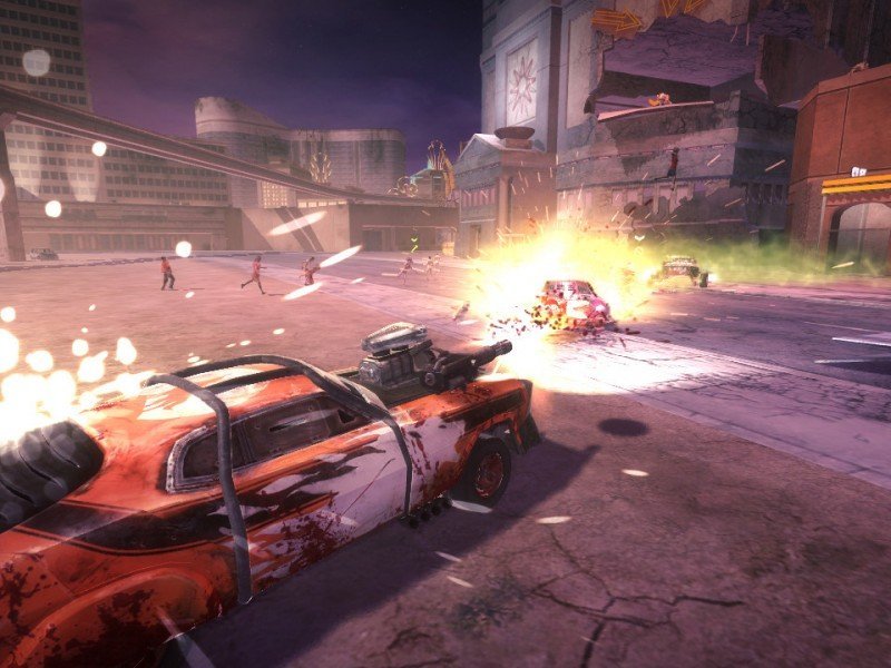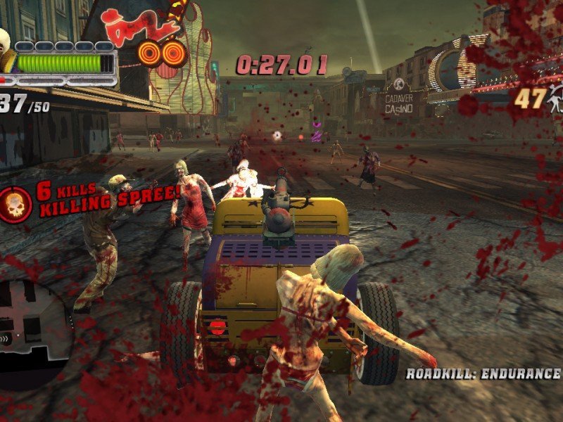 Blood Drive vous propulse dans une émission de combat automobile, où vous allez devoir choisir un véhicule et exterminer du zombies à tout va. Le jeu ne présente aucun scénario digne de son nom ni même de mode carrière, et n'expliquera pas comment ce fléau a pu se répandre. Le concept se montre assez rustre, il suffira d'écraser les morts-vivants, tout en finissant premier de la course (condition obligatoire pour accéder aux manches suivantes). Le tout se déroulant dans six environnements pour le moins post-apocalyptiques. Plusieurs types d'armes sont à votre disposition, et de même que des pilotes aux personnalités variées. Et comme dans un Mario Kart par exemple, les véhicules présentent aussi des caractéristiques différentes, à savoir une meilleure vitesse de pointe, une protection accrue, ou bien un arsenal plus complet. Après avoir choisi si vous souhaitiez faire une course simple, un défi ou un tournoi, nous voici donc lancé au coeur de l'action. Et il faut l'avouer, le concept de Blood Drive pouvait s'amuser très amusant. Dans les faits en revanche, on est assez désappointé. Première critique, le jeu oblige à tuer un certain nombre de zombies en un délai très court. Et lorsque l'on sait que l'intelligence artificielle est assez relevée, vous risquez d'effectuer encore et encore les mêmes épreuves avant de pouvoir remporter la partie. La faute à une jouabilité qui manque de finesse, et surtout un moteur physique dénuée de bon sens.