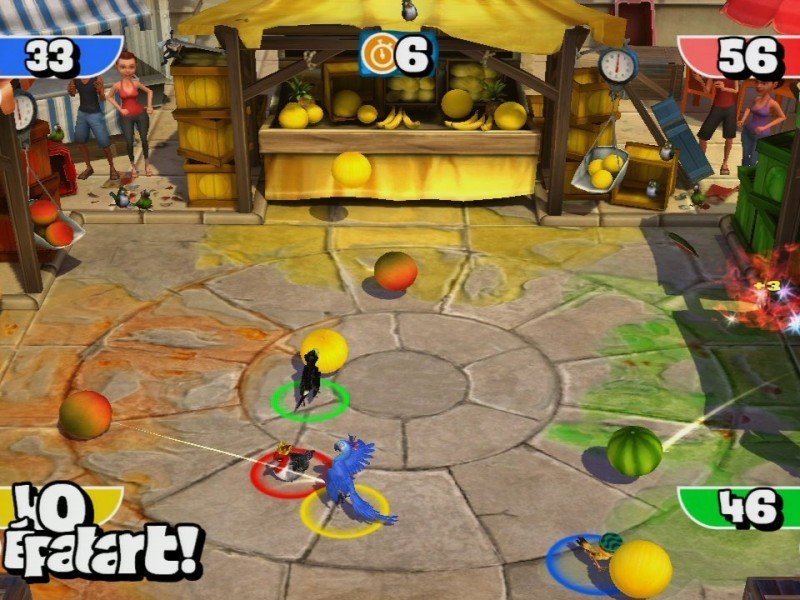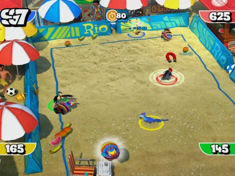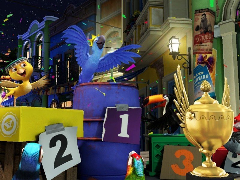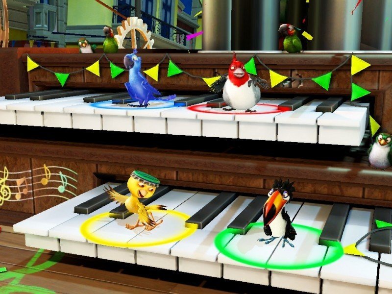 Blu, un perroquet bleu d’une espèce très rare, quitte sa petite ville sous la neige et le confort de sa cage pour s’aventurer au cœur des merveilles exotiques de Rio de Janeiro. Sachant qu’il n’a jamais appris à voler, l’aventure grandiose qui l’attend au Brésil va lui faire perdre quelques plumes ! Heureusement, ses nouveaux amis hauts en couleurs sont prêts à tout réveiller le héros qui est en lui, et lui faire découvrir tout le sens de l’expression « prendre son envol ». Pour son arrivée sur consoles, Rio n'a pas choisi la voie du classique jeu d'action/plateformes, mais celui du party game. Aussi, nous retrouvons une quarantaine de mini-jeux jouables jusqu'à quatre, où le déroulement est pour le moins linéaire et le challenge quasi-inexistant. Certes, le jeu est avant tout prévu pour le jeune public, mais tout de même ! En outre, les épreuves proposées manquent singulièrement de panaches, aucun retournement de situation n'est à craindre, au contraire d'un Mario Party par exemple. On trace sa route sans se retourner, et on termine assez rapidement le mode Histoire, trop sans doute d'ailleurs. Quant au mode Fête, il ne permet pas grande fantaisie, si ce n'est personnaliser sa partie. La Danse du Carnaval offre pour sa part, le luxe de récupérer davantage de marmousets que ses concurrents, histoire d'assurer une meilleure chorégraphie dans les intermèdes. Enfin, la Roue de Carnaval est une gigantesque roue, où le hasard vous lancera un mini-jeu aléatoire, tandis que le Gala de Guirlandes transforme les points en guirlandes qu'il faut lancer sur des cibles à l'écran.