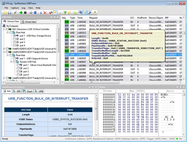 (0 Votes)USBTrace is a software-only USB Protocol Analyzer for Windows. USBTrace can monitor USB transactions happening at USB host controllers, hubs and devices. USBTrace is a 100% software product. Especially suited for inspecting host side USB protocol. USBTrace supports Windows 2000, Windows XP, Windows 2003 Server, Windows Vista, Windows 7 & Windows 8 operating systems (Both 32-bit and 64-bit). Features: 1. USBTrace supports Windows 2000, Windows XP, Windows Server 2003, Windows Vista, Windows 7 and Windows 8 operating systems (Both 32 Bit and 64 Bit versions). 2. Works with USB 1.x, 2.0 and 3.0 Host Controllers, Hubs and Devices. 3. USBTrace can capture USB transactions at USB host controllers, Hubs and Devices 4. USBTrace can capture USB transactions handled by any device object in the USB device stack. 5. USBTrace captures and displays valuable information for WDM driver developers and firmware authors. 6. USBTrace is a non intrusive bus analyzer. It does not use any filter drivers to capture USB transactions. 7. USBTrace can capture all USB transactions during device enumeration. 8. Automatic capturing for hot plugged devices. 9. Search and filtering options can be performed on captured information. 10. Export monitored USB requests to HTML, XML, CSV or text file. 11. Supports continuous capture for non stop analysis. 12. Supports decoding of class specific USB requests and descriptors. (HID, Hub, Mass Storage, Bluetooth, Still Image Capture, Video, Audio, Printer, Smart Card, Vendor Specific, WUSB) 12. Supports background capturing for high performance capture sessions. 13. View performance statistics for each capture session. Performance reports can be exported as HTML or text files. 14. Add comments and bookmarks to captured data.